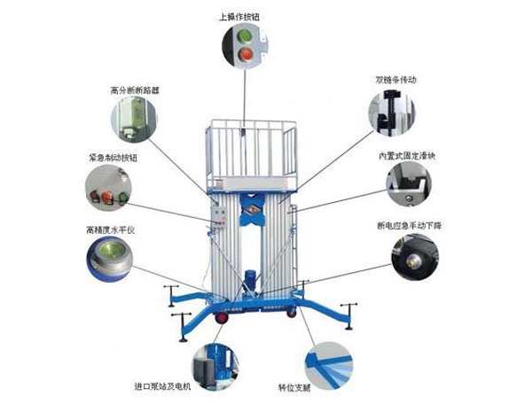 雙柱鋁合金升降機:升降動力分為220V、 380V,或電瓶動力源,特殊環(huán)境也可采用防爆泵站及防爆電器。升高4——10米,載重100-150公斤。主體采用高強度優(yōu)質鋁合金材料,具有造型美觀、體積小、重量輕、升降平穩(wěn)、安全可靠等優(yōu)點。廣泛用于工廠、賓館、餐廳、車站、影劇院、展覽館等場所,是保養(yǎng)機具、油漆裝修、調換燈具、電器、清潔保養(yǎng)等用途的最佳安全伴侶。